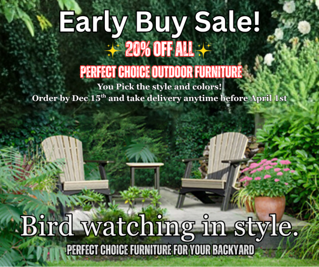 Give the gift that lasts for decades! With Perfect Choice Furniture, you can choose the style and colors that fit your perfect outdoor space. A meaningful, beautifully crafted gift that creates a cozy place to relax, unwind, and enjoy the birds all year long.