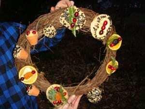 Natural rough brown string, ribbon and raffia can be used for hanging the decorations. Also, consider decorating with lengths of natural wool. The birds will use this material for nesting in the spring.